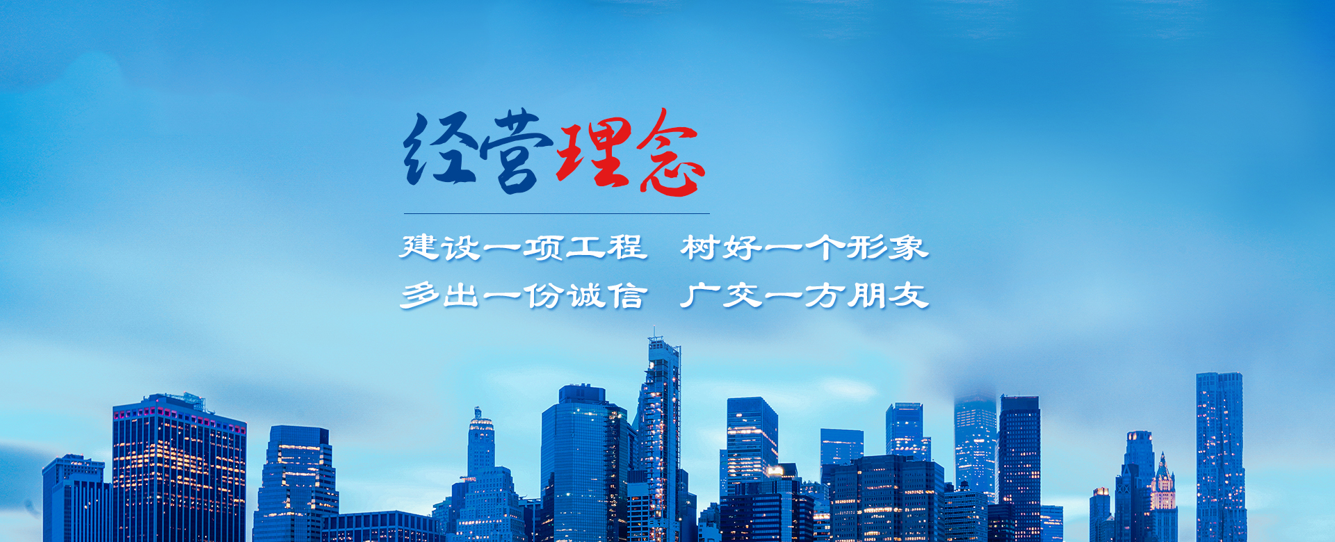 公司以建造合格建筑產(chǎn)品、助力國家建設(shè)為使命,以構(gòu)建幸福企業(yè)為愿景。公司深知助力國家建設(shè)為使命所擔(dān)負的責(zé)任,故以“如履薄冰、如臨深淵、高調(diào)精細做事、低調(diào)謙虛做人”為工作理念,建立了完善的管理制度和質(zhì)量保障體系,以人為本,構(gòu)建和諧環(huán)境。公司牢固樹立安全意識、文明意識、質(zhì)量意識、環(huán)境意識和精品意識。在公司質(zhì)量管理過程中貫徹“雙百”方針:即工程合格率100%,客戶滿意率100%。以“建設(shè)一項工程,樹好一個形象,多出一份誠信,廣交一方朋友”為公司經(jīng)營理念。